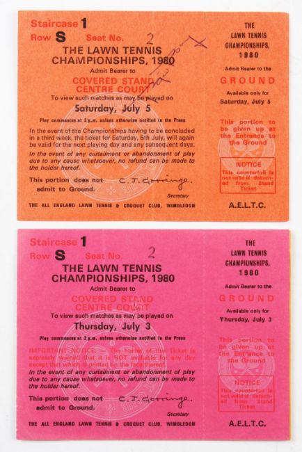 Tennis - 1980 Lawn Tennis Championships Wimbledon Tickets - To include tickets Men's Semi- Final Borg beat Gottfried / McEnroe beat Connors, Ladies Final Goolagong-Cawley beat Chris Lloyd with stub together with Men's Final Borg (5th title The Classic Match and last Wimbledon title) beat McEnroe with stub (3)