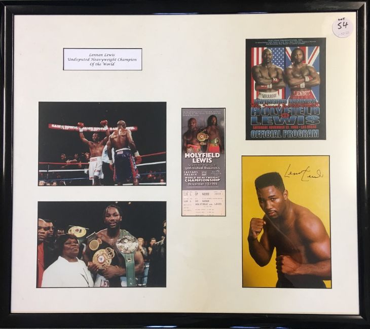 *WITHDRAWN* Boxing World Heavyweight Champion Lennox Lewis signed display incl Holyfield v Lewis Official Programme and Ticket with a signed print below and non-signed prints to the side depicting a winning Lewis - mf&g overall 68x60cm #