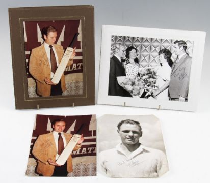 Cricket - Informal Signed K Higgs Photographs: B & W press photo, 2 colour holding a signed bat, B & W presentation photo all signed by K Higgs (4)