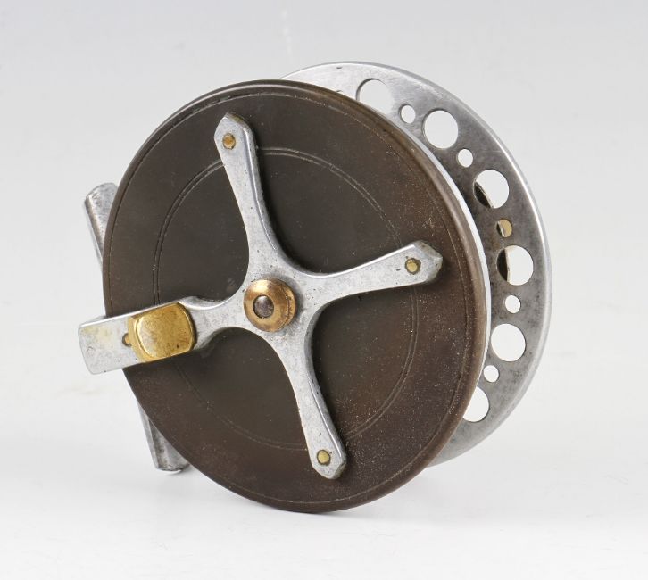 Scarce Marston Crossle Patent alloy, wooden, ebonite and brass star back combination reel - 4" dia. with rear drum perforations , smooth alloy foot, wooden drum core - runs smoothly