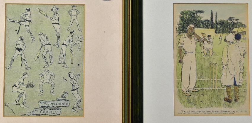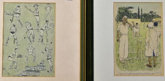 6x Hand Coloured 'Punch' Cricket Prints with How fast bowlers are made, and other comedy prints, all framed and measure 25x32cm approx. plus another 'Some Attitudes in Cricket' (7)