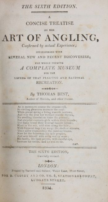 Best, Thomas - "A Concise Treatise On The Art Of Angling" 6th ed 1804, engraved frontis of a lady and gentleman fishing, contains the table of sun rising every third day in the year, adverts, old style half calf binding.