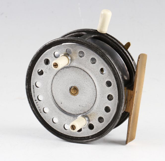 Wallis Watson 4" reel: Twin ivorine handles, smooth brass foot, pat 136217, side lever check, screw drag adjuster, marked Fosters Ashbourne