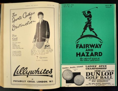 1930/31 The Official Organ of the Ladies Golf Union Magazine - "Fairway and Hazard" Vol. 1 No.1 March 1930 to No.52 February 1931- weekly magazine - in half leather publishers binding c/w all the original covers - one of the most comprehensive coverage of ladies golf world wide - together with superb collection of various golfing related advertisement - a must for any serious collector and source of information