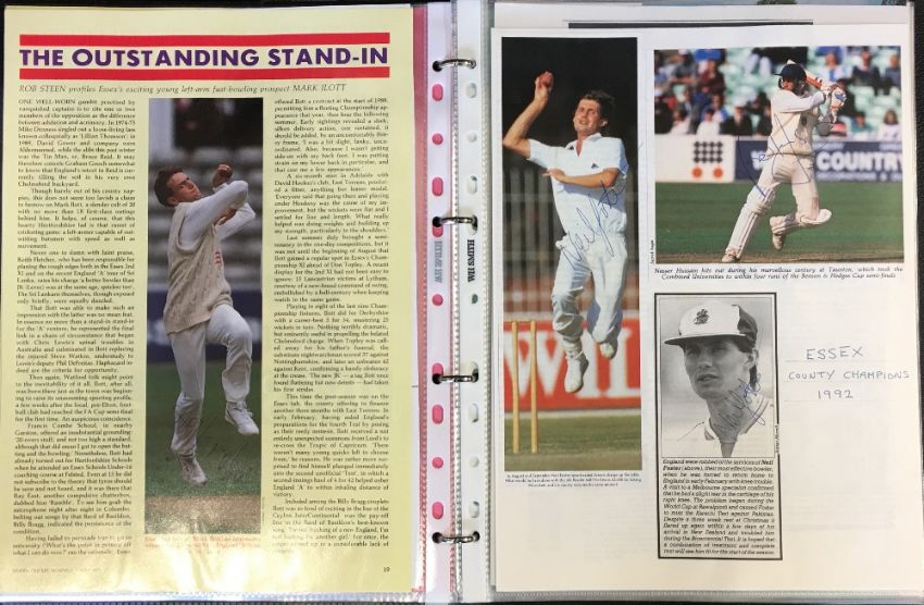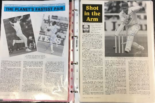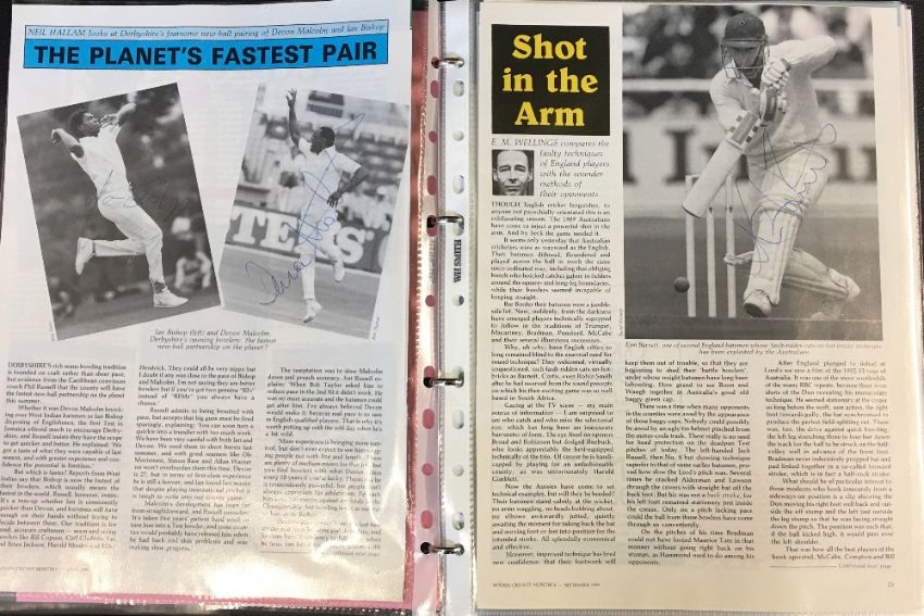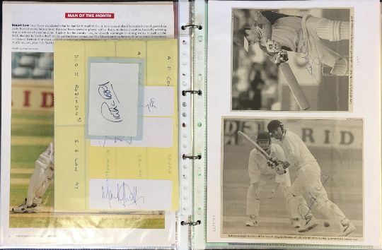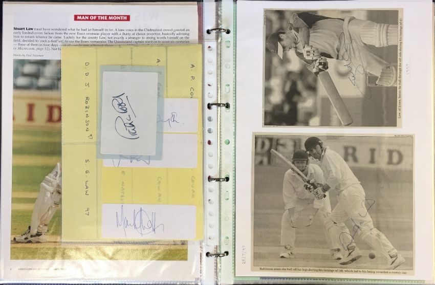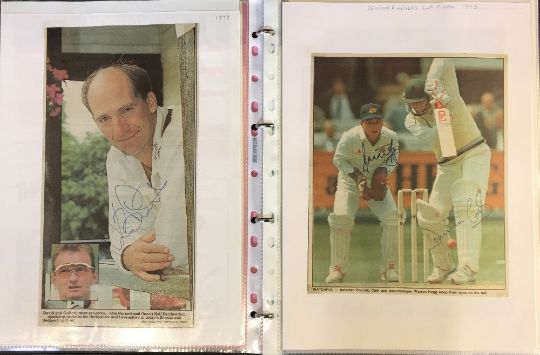 Cricket Autographs - Derbyshire, Durham, Essex and Glamorgan Counties Cricket Player Signatures on newspaper & magazine cuttings, Wisden magazine covers, photocards and other related items including players Ian Bishop, Devon Malcolm, Dominic Cork, Karl Krikken, Peter Bowler, John Morris, Keith Piper, Devon Malcolm, Paul Parker, Simon Brown, Phil Bainbridge, Nasser Hussain, Mike Garnham, Mark Waugh, Alan Butcher, Robert Croft, Steve James, Adrian Dale and others, approximately 130, all housed in folder.