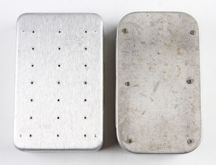 2x Alloy fly and bait boxes - Perrine dry fly box c/w 40 various flies and lures and Wheatley Silmalloy spinner box