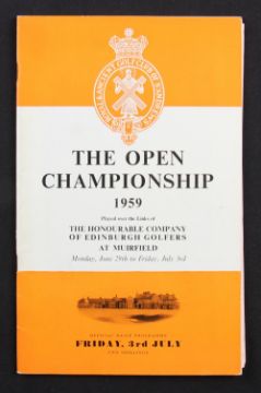 1959 Official Open Golf Championship programme - played at Muirfield on the final day Friday 3rd July c/w draw sheet and won by Gary Player - both very clean (G)