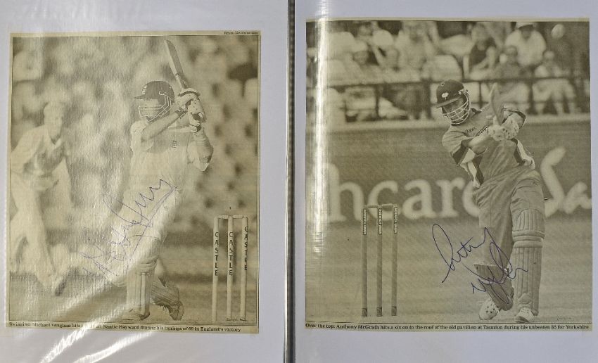 Cricket - 1999/2000 England, County and Tour Signed Newspaper Cuttings to include Darren Gough, Michael Gough, Andrew Flintoff, Mark Butcher, Alec Stewart, Alex Tudor, Ashley Giles, John Crawley, Anthony McGrath, Craig White, Matthew Maynard, Goodwin, Guy Whittall, Mluleki Nkala, #77, all corner mounted on card, housed in folder.