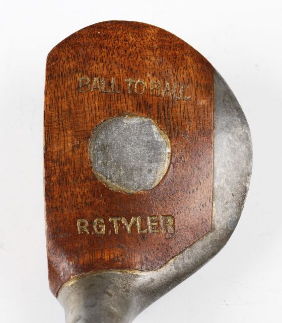 R.G Tyler Patent "Ball to Ball" alloy and wood combination driver - with alloy central crown disc and similar central firing disc to the face - replaced period full length leather grip