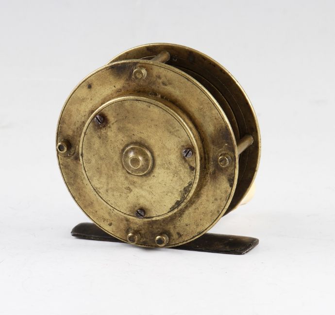 C1880s Eaton & Deller Maker, 6/7 Crooked Lane, London all brass crank wind winch, 2.75" diameter, curved winding arm, turned handle, smooth ratchet click in raised check housing, original pillars,