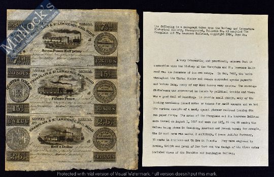 Canada - Champlain & St. Lawrence Rail Road - 1837 Complete uncut sheet of 3 Banknotes - different denominations of 15 Sous being 7½ pence, 50 Sous being 15d and Un Ecu being “2 Shillings & 6 pence. Each illustrating different early Locomotive and passenger train of the period. Black printing, size 7” × 8½”. The first railway of Canada from St, John to La Prarie opened on July 21st 1837 by the Governor of Lower Canada