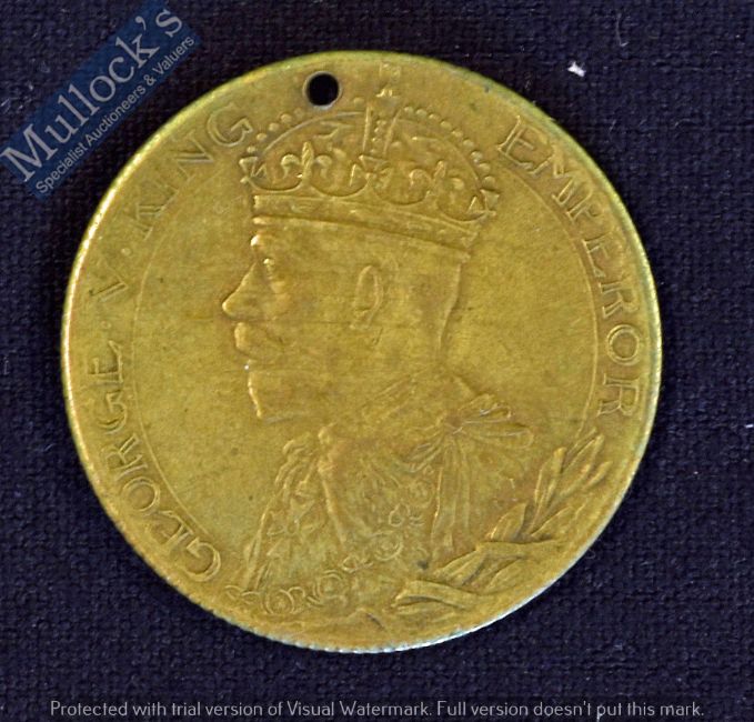 WWI Anglo-India Peace Medal 'George V. King Emperor' - The reverse features a wounded soldier helping a Sikh soldier and states '1914 1919 For Freedom And Honour'. The other side features a bust of the King and states 'George V. King Emperor'. Small pin hole to top, o/w in good condition