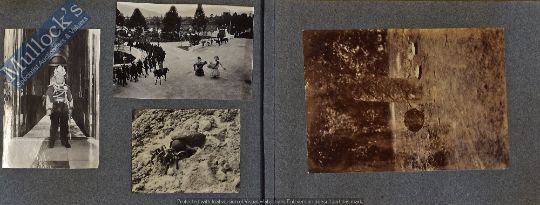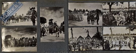 India Photograph Album Containing Some 230 Photographs. Between 1913 and 1922 - Mostly each describing place where taken, what the subject is and date. Of particular interest are in 1922 photographs of a Royal State Wedding in Nepal, procession on Elephants, a Royal infant in military dress uniform etc. The photographs were also taken in Aymer, Belgaum Mussouri Hill station, Udaipur, as well as a few of leave back in Taunton. They feature Camels, Dancing Bear, Working Elephants, hunting, their various homes in India, his wife, their children and friends. Etc etc. The photographer was probably a British Resident (Representative) in some of the Princely States in India, later with the British Legation in Kathmandu in Nepal. Size 9” × 7¼.