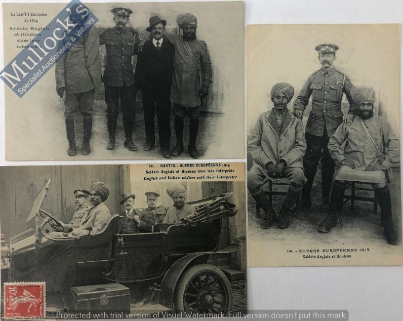 India & Punjab – Sikh, French & Hindu Officer in France Three vintage WWI postcards showing the same 3 soldiers in France, c.1914