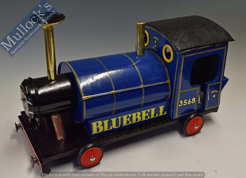 Children’s Sit on Bluebell Train in blue and black with metal and wood components, measures 60x25x42cm approx.