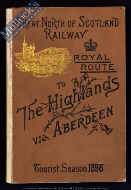 Great North Of Scotland Railway. Royal Route To The Highlands Via Aberdeen. Tourist Season 1896 - An extensive 214 page publication full of photographs, time tables, maps and details of various circular tours by Train, Steam Ship and Horse drawn coach etc. Also many adverts for Hotels some with engraved illustrations. In cloth board cover, size 5” × 7¼”.