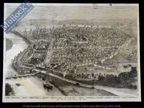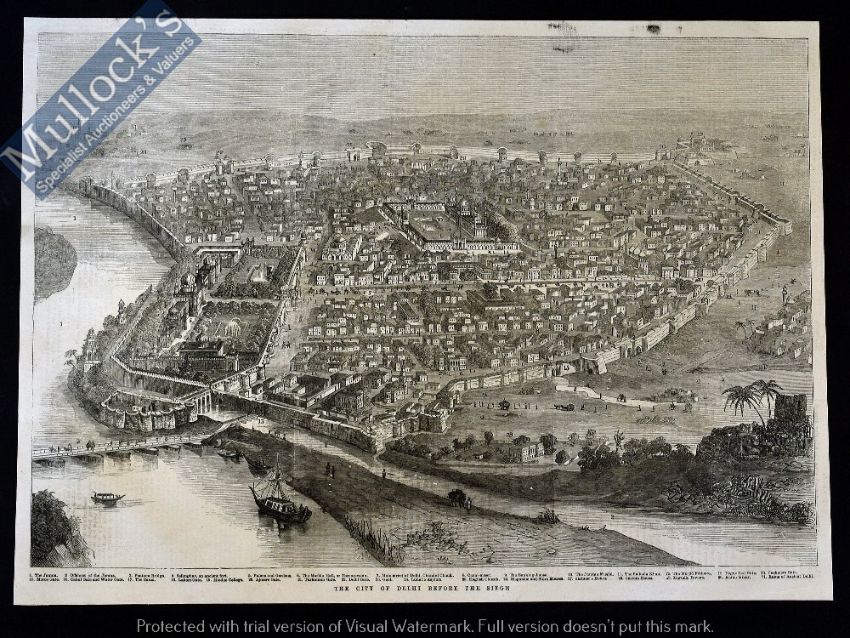 India – The City of Delhi Before the Siege Original Print 1858 of a birdseye view of the city listing principle locations, measures 35x35cm approx., mounted