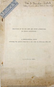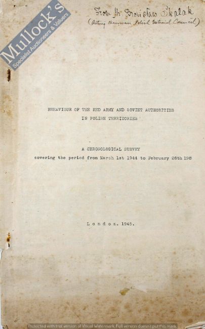 WWII Behaviour of the Red Army and Soviet Authorities in Polish Territory Publication duplicated type written document in English, by Bronislaw Skalak, member in London from 1943 onwards of the Polish Government in Exile and one time acting chairman, chronological survey covering the period from March 1st 1944 to February 28th 194, ink ms note in Polish to cover ‘From Mr Bronislaw Skalak’ with a later ms note in pencil ‘Acting Chairman Polish National Council’