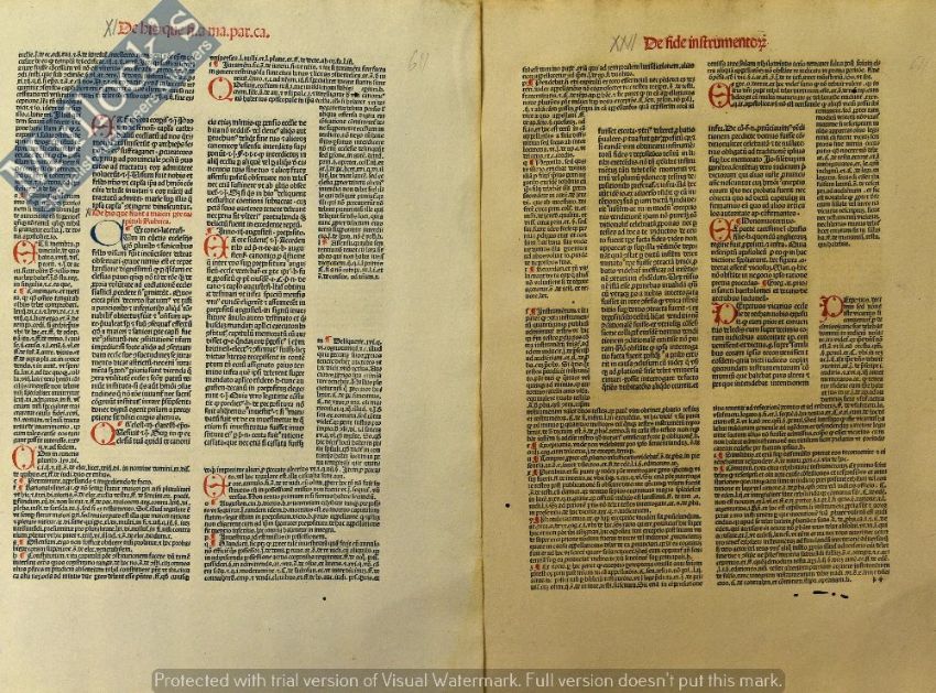 Large Decorative Leaf From “Decetales” By Pope Gregory IX - Printed at Speyer in 1486 by Peter Drach. Some of the Capitals, usually the blue ones are hand painted, but many are printed in colours. Bibliographical references, Goff G-461, Gesamtkatalog der Wiegendrucke 11473. Large impressive size of 11½” x 16½”.