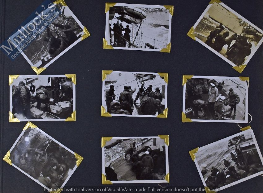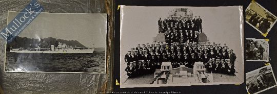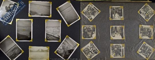 HMS Constance Far Eastern Fleet Photo Album with various photographs and postcards, depicting various scenes, noted to the front China, Japan, Korea and Malaya, worth inspecting, photographs are not laid down, and are presented well (Quantity)