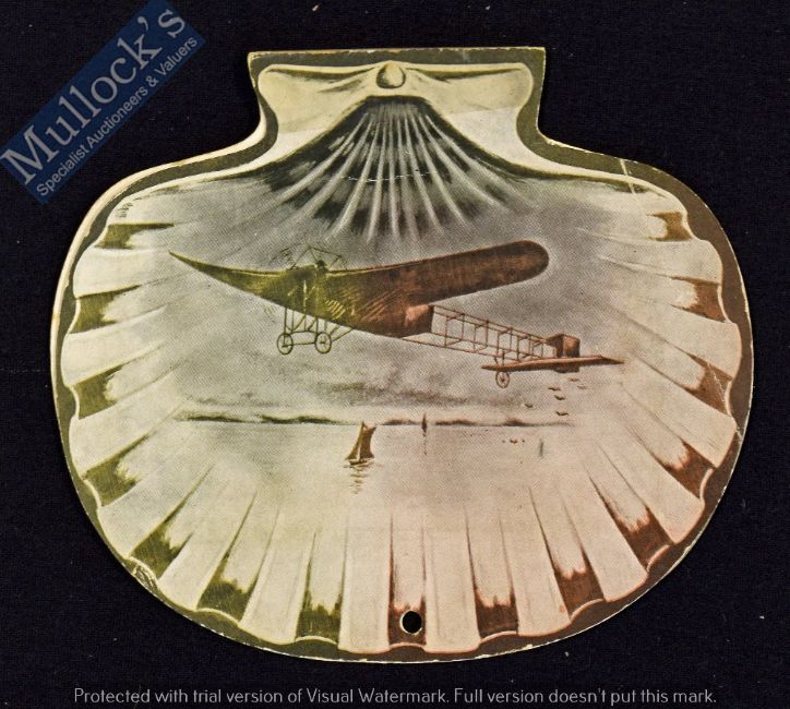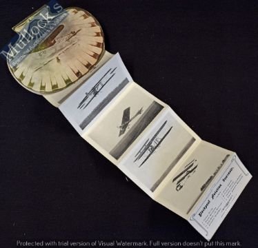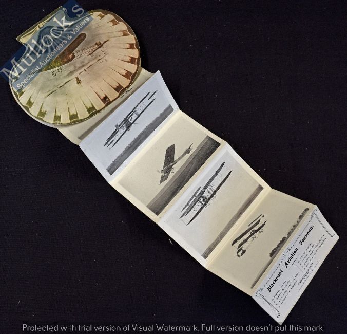 Blackpool Aviation Souvenir 1910 - Two sided Card in shape of Sea Shell with illustration of period Aeroplane with 8 drop down photographs of the aircraft in that weeks event and listing them in the last panel. Folds down to size 23¾”. In very good condition