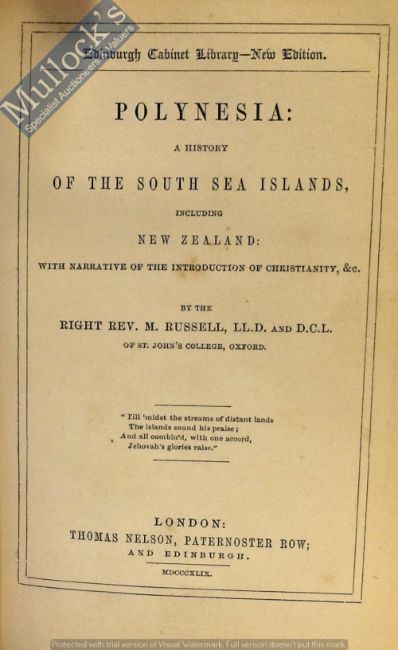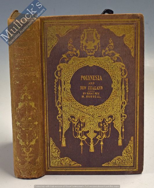 New Zealand - Polynesia And New Zealand by M. Russell 1849 Book First Edition. An interesting 449 page book extensively detailing life in New Zealand, Fiji, Tonga and Sandwich (Hawaii) Islands at that time. In original cloth board binding with attractive gold tooling, size 4¼” x 6”.
