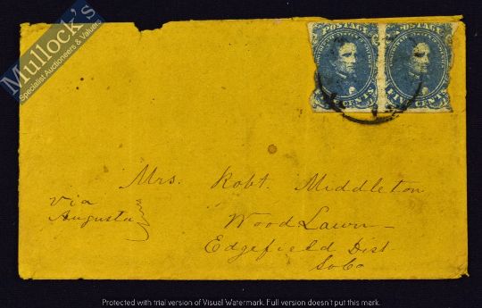 Confederate States - A Scarce Pair Of Early Confederate 5 Cents (Pen Cancelled) Bluestamps - With Portrait Of Jefferson Davis The Confederate President On Cover Circa 1862-63. Sent via Augusta. Posted to Mrs Robt. Middleton, Wood Lawn, Edgefield District, South Carolina. Unusual yellow cover. Size 5¼” × 3”.