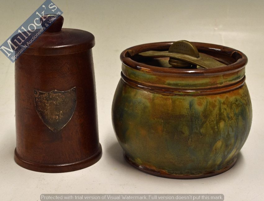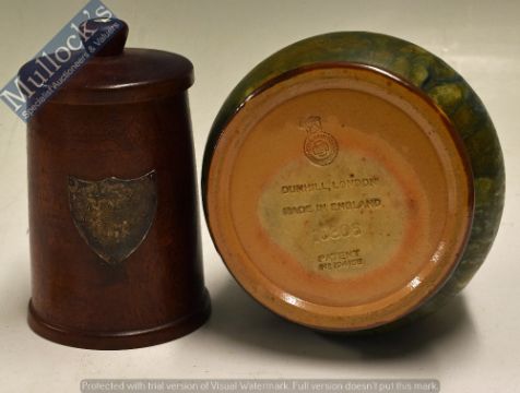 Vintage Smoking Collection – Dunhill White dot Tobacco Jar in exotic wood with s/p shield plaque for ‘West Africa Box’ and ‘Tobacco’ plus a Royal Doulton for Dunhill stoneware twist top vintage tobacco jar, both circa 1930s, both in good condition, the Doulton jar fully marked to the underside with minor chip to inner of rim (2)