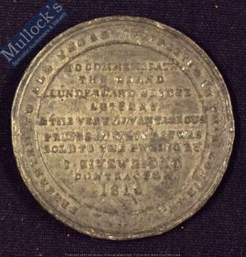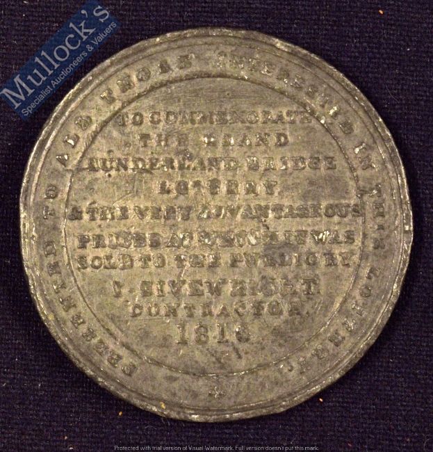 Sunderland Bridge Lottery 1816 Medallion - issued to promote this Lottery. Obverse; View of the Bridge. Reverse; Legend Presenting to those interested in the Lottery. To commemorate the Grand Sunderland Bridge Lottery & the very advantageous prices at which it was sold to the public by I Sivewight. Contractor 1816. White metal 45mm diameter. Then the largest single span bridge in the World. First Prize was £5,000 and there were 120 prizes of £100.