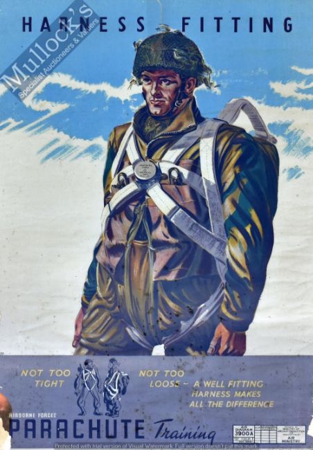 WWII Original Airborne Forces Training Poster: Harness Fitting Parachute Training featuring Paratrooper in full airborne uniform, Restricted (For Official Use Only) Date Nov 1944, Prepared by Ministry of Aircraft Production for Promulgation by Air Ministry, Printed by the H M Stationary Office by Nathaniel Lloyd & Co London 42 x 30” f&g (Note some damage to bottom corners)