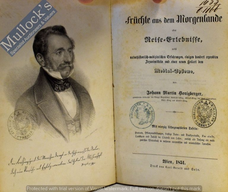 India - Account of Maharajah Ranjit Singh’s Court Physician 1851 Book – ‘Früchteausdem Morgenlande – Honigberger’ a fine first edition of 'Früchteausdem Morgenlande' [Fruits from the Morning Land] by Dr Martin Honigberger London 1851. Includes an amazing lithographed folding panorama of Lahore during the Sikh reign and 38 engraved plates and a map, marbled boards with leather spine, (worn) pp590. Plates include portraits of all the prominent members of the Lahore Durbar including Maharaja Ranjit Singh and his wife Jinda and son Duleep Singh, Maharaja Karak Singh and Sher Singh. An extremely scarce work. Honigberger was a personal physician to Maharaja Ranjit Singh. Khushwant Singh's History of the Sikhs Princeton NJ 1963-1966 describes him as the Hungarian doctor Honigberger who mixed gunpowder for the artillery and distilled brandy for the Maharajah. He was in fact from the town of Kronstadt Central Romania. A highly sought after work.