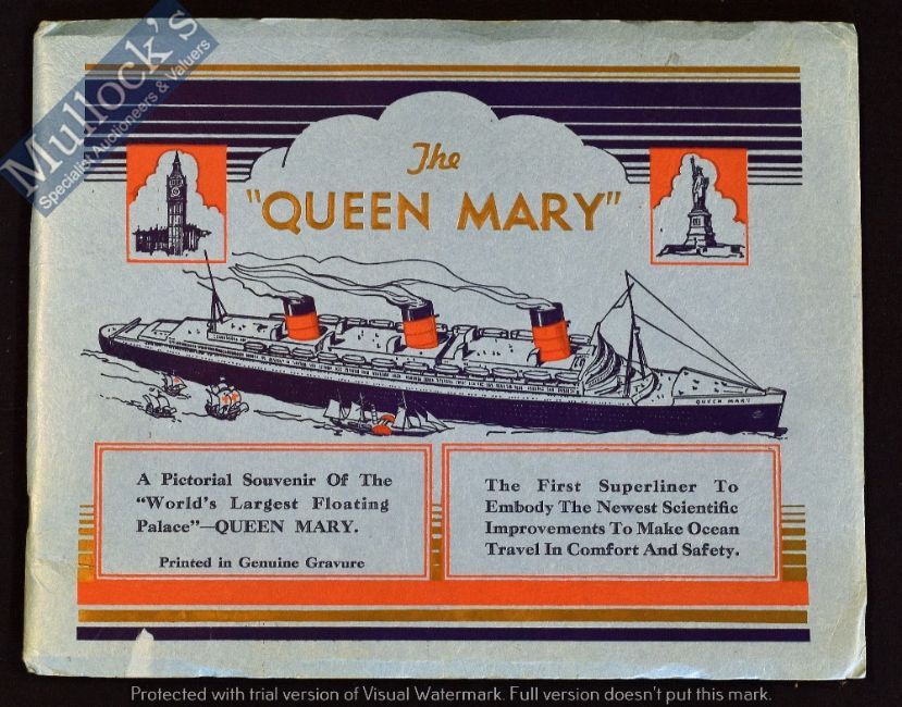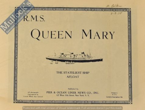 The Queen Mary Publication Published in 1936 The Year of the Maiden Voyage - A very impressive fine 48 page publication featuring 25 full page photographs of the ship, its State Rooms, the various Art Deco art work panels and pictures. With detailing text.  Pages printed on quality thick art paper. In embossed and printed deckled card cover, size 11” ? 8¾”.  Scarce issue