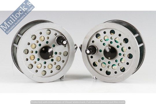 Fishing Reels - Shakespeare Beaulite Salmon Fly Reels both 4” c/w stainless steel line guides (L&RHW) both with lines and in hand made rexine pokey bags, good overall condition (2)