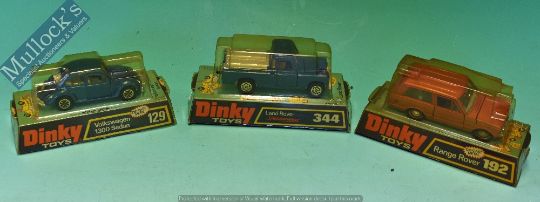 Dinky Toys 344 Land Rover Speedwheels Diecast Model Together with 192 Range Rover 129 Volkswagen 1300 Sedan in original boxes (box has discolouration) (3)