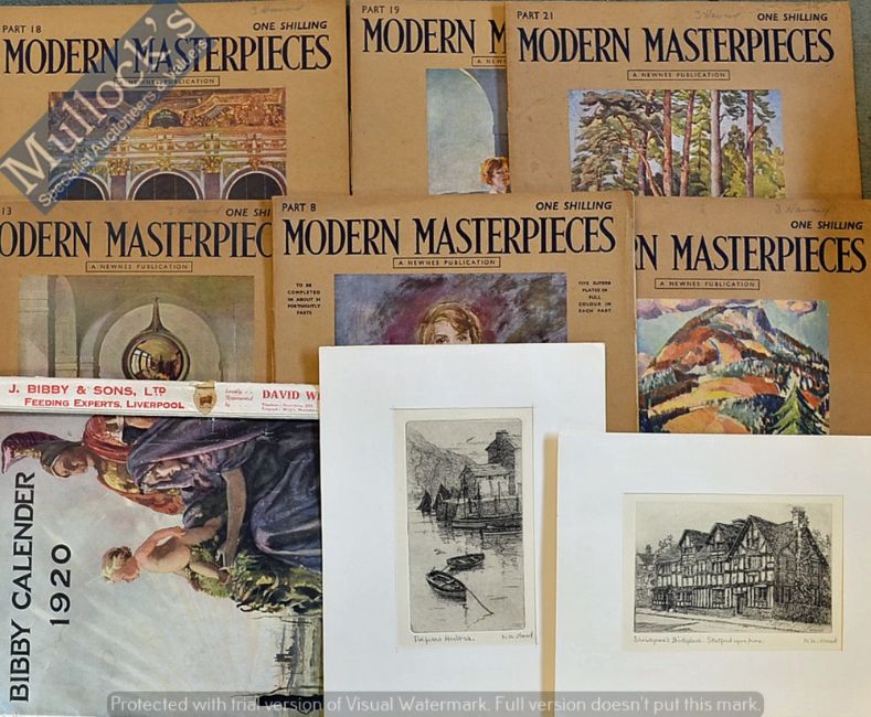 N. W. Ward Prints – to include Shakespear’s birthplace and Polperro Harbour both signed the artist below, together with The Bibby Calendar 1920 and Modern Masterpieces publication 8, 13, 18, 19, 21 and 22 (9)