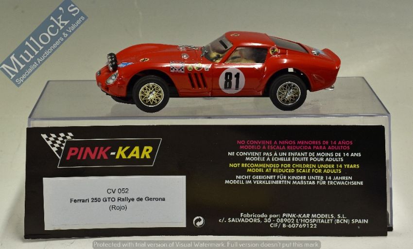 Scalextric/Slot Cars - Pink-Kar CV 052 Ferrari 250 GTO Rallye de Gerona (Rojo) in red with No81 decals, 4x spot lights to the front, appears in good condition, with plastic base and top