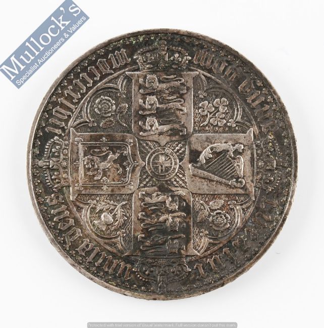 1847 Queen Victoria Gothic Crown Silver Coin the obverse Gothic type bust, the reverse with Crowned cruciform shields, Undecimo inscribed to the edge, dia 38mm approx., 28.3g, fine / very fine with dark toning to the reverse