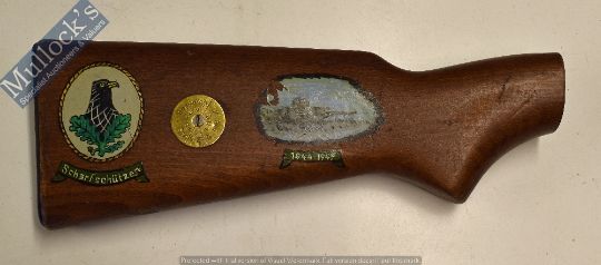 WWII – German Snipers Rifle Butt – marked 22812 to the end, given as a prize in the defence Germany, the butt features a painting of sniper together with the Scharfschutzen or sniper’s badge, 1st class with gold trim. The Sniper’s Badge was instituted on 20 August 1944 having three grades; Third Class (no cord) for 20 enemy kills, second class (Silver Cord) for 40 enemy kills and first class (Gold cord) for 60 enemy kills. The enemy kills were counted from 1st Sept 1944, with every kill having to be confirmed by witnesses and reported to the unit.