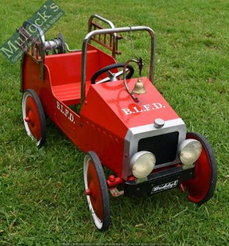 Child’s Pedal Fire Engine in red with ladders and hose rear, bell to front, wood and metal components, ‘Buddy L Fire Department’ Decals, measures 95x40x56cm approx.