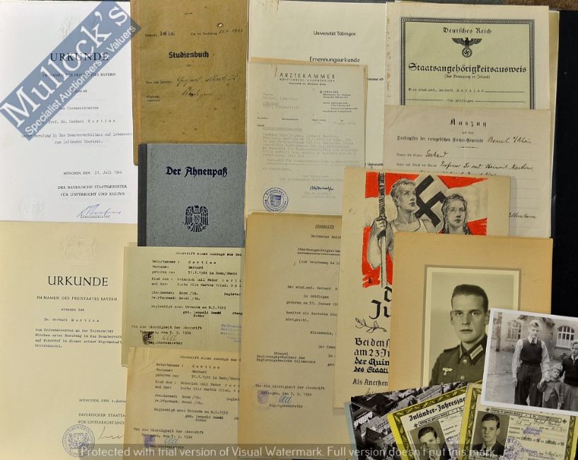 WWII Wehrmacht Doctor Gerhard Martius (1924-1998) Comprehensive Paperwork Collection – to include photographs, his ‘Ahnenpass’ [Ancestor Passport], certificates allowing him to practice, student book and personalised Hitler Youth ‘Jugendfest’ 1934 certificate. Rare to find such a complete set of paperwork relating to a doctor including his post war certificates (#30)