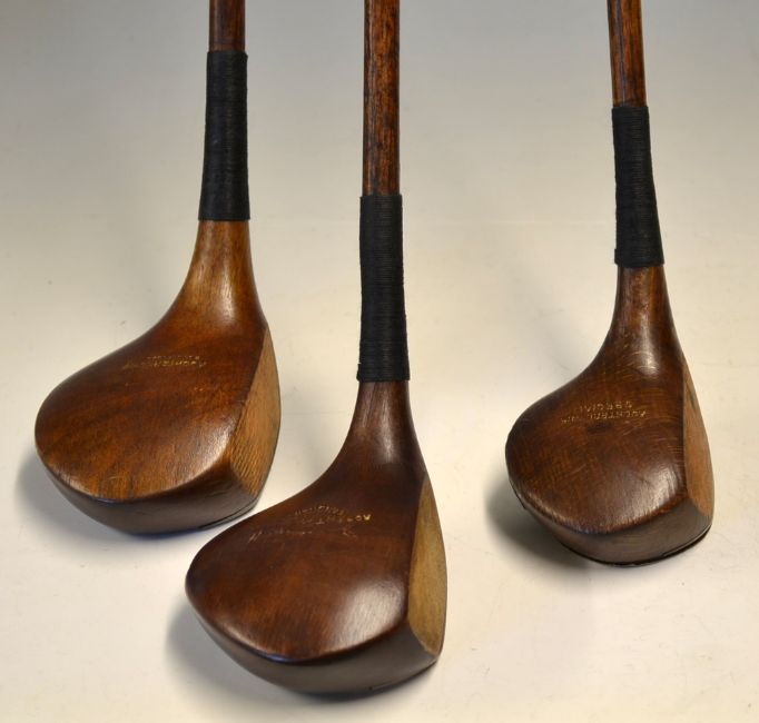 3x various St Andrews socket head woods - R Forgan St Andrews large head spoon, Auchterlonie large head driver with shaft stamp and an Auchterlonie beech wood brassie
