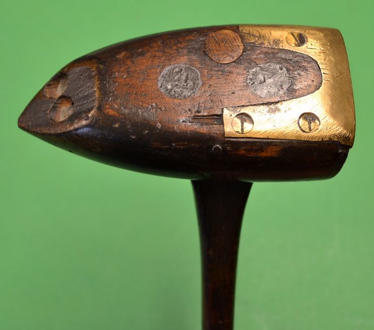 Brewster Simplex Patent centre shafted boat shaped spoon c.1897 – with brass inlaid sole plate and fitted with full length thick hide grip with underlisting = with good makers oval and patent stamp marks are clearly visible to the crown