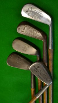 5x assorted irons – Ben Sayers Benny Y model well lofted sand iron by Tom Stewart with Ruflex style pattern face markings; James Spence St Andrews Mashie Niblick; Geo McDowall Prestwick; Decca Rust Proof no. 2 Iron by Fife Golf Co and Geo Nicoll Nap Iron with a J.M Anderson signature stamp.