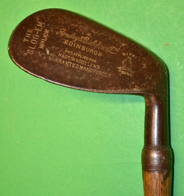 Rare Todrick Patent Screw hosel iron – by Hendry and Bishop and stamped “The Slog-em” niblick with bore thro sole and punched dot face markings – full hide grip