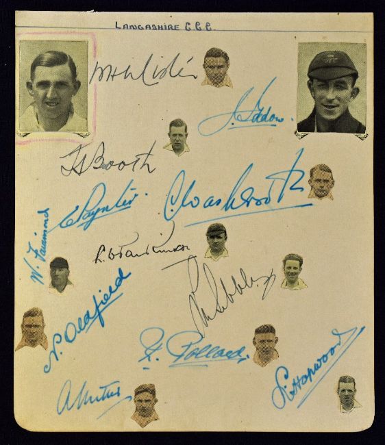 c.1930s Lancashire Cricket Autographs to include Washbrook, Paynter, Oldfield, Hopwood, Booth, Sibbles, Pollard, Farrimond, Iddon, Lister, Parkinson etc. (12) all to an autograph album page with newspaper cuttings of players, nicely presented