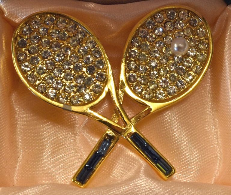 Modern Tennis Brooch in gold gilt with two tennis rackets crossed with pearl Tennis ball to one racket, jewelled handle and head, pin to reverse, measures 4.5x4cm approx. comes with box