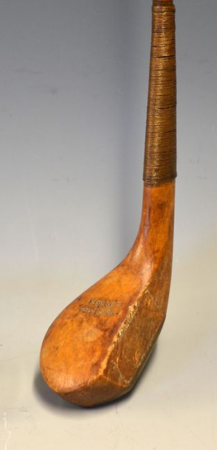 Interesting Army and Navy scare neck brassie – with full wrap over brass sole plate fitted with limber lemon wood shaft (37”) and original full length hide grip with underlisting