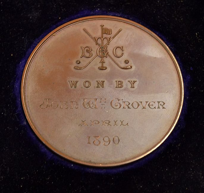 1890 Tooting Bec Golf Club Bronze Medal: the obverse embossed with a Period Golfer and with Tooting Bec Golf Club Medal Competition Medal to the border and on the reverse embossed with details and engraved “Won by John William Grover April 1890” - made by Waterlow & Sons Limited London 6cm dia in makers original case
