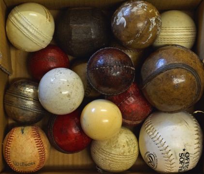 Mixed Selection of Various Sports Balls to include Cricket, Baseball, Softball, Rounders, an ivory (pre 1947) snooker ball, etc. mixed condition, most appear still playable (17) Small Box