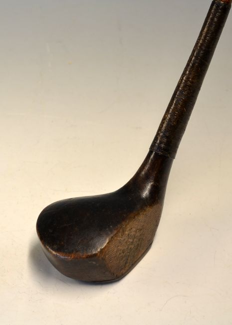 Black Stained beech wood scare neck driver stamped D Adams to the shaft below the original full length leather grip with underlisting